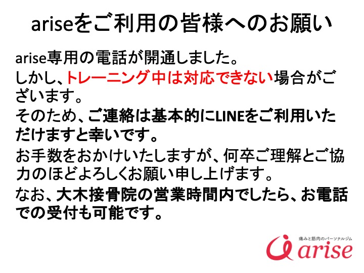 「ariseのホームページを見て電話しました」とおっしゃってくださればスムーズにご予約できます。