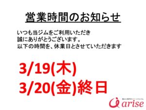 大木接骨院の営業時間に伴い20日(春分の日)の振替休日のため、3月19日(水)を休みとさせていただきます。